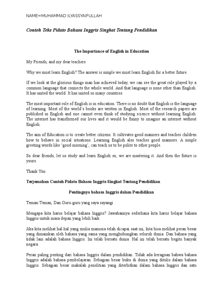 Contoh Teks Pidato Bahasa Inggris Singkat Tentang Pendidikan Pdf