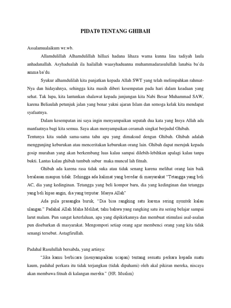 Naskah pidato tentang ghibah - Kegiatan yang sering dikenal sebagai bergunjing atau ghibah memang seringkali tidak begitu terlalu dihiraukan oleh kita khususnya bagi kalangan kaum perempuan. 15 Contoh teks ceramah untuk muslim singkat dan mudah dimengerti. Karena ghibahngupat adalah salah satu perbuatan yang membuka aurat atau menceritakan aib seseorang baik itu menceritakan tentang aib diri atau bisa.